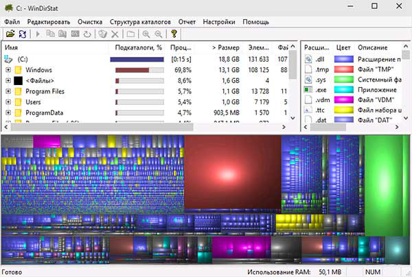 Нужно выбрать раздел для сканирования и нажать кнопку "Анализ". Работает она заметно быстрее чем WinDirStat. Результаты так же отображаются в виде цветных прямоугольников разного размера, выбрав один из которых мышкой можно получить полную информацию о файле или папке и соответственно принять решение и выполнить с ними необходимые действия. Так же есть возможность использовать фильтр, чтобы отобразить файлы только определенного типа.