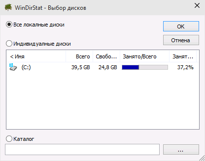 Например, можно использовать утилиту WinDirStat. Она полностью бесплатна и имеет достаточно понятный интерфейс на русском языке. При запуске программа выводит окно для выбора раздела для анализа. Необходимо выбрать раздел который хотим просканировать или оставить выбранным пункт "Все локальные диски" и нажать ОК.