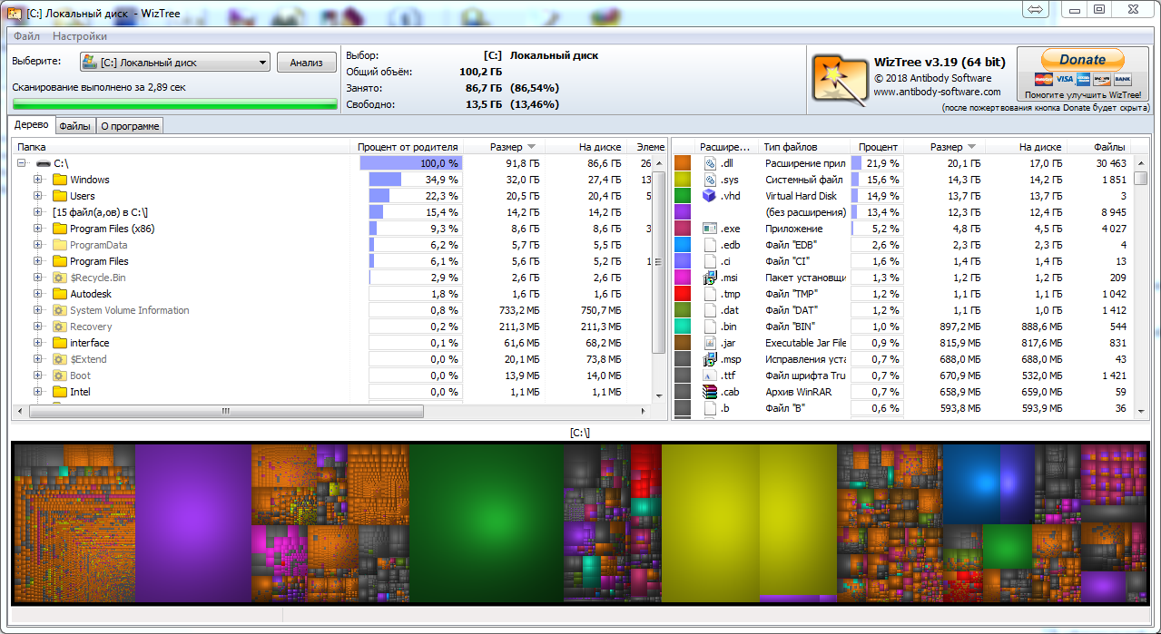 Очень схожим функционалом обладает утилита WizTree. По умолчанию программа запускается на английском языке, но в меню Options - Language можно выбрать Russian и все сразу станет понятнее. Принцип работы схож с WinDirStat.